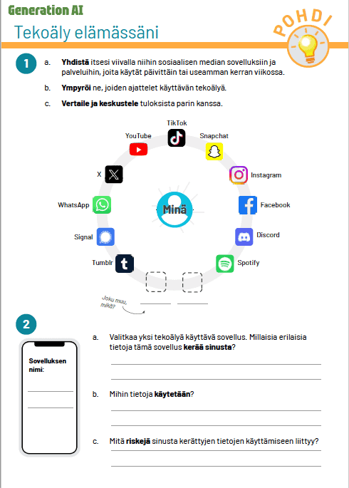 Denna uppgift delas in i tre avsnitt med hjälp av uppgiftsbladet ”AI i mitt liv” (delas ut av läraren till eleverna antingen elektroniskt eller som en utskrift)